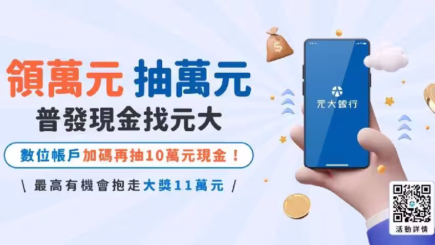 指定入帳至「元大銀行數位存款帳戶」,即可再享10萬元回饋金的加碼抽獎機會,最高一次能抱走11萬元現金,本次活動總獎金高達新台幣50萬元。
