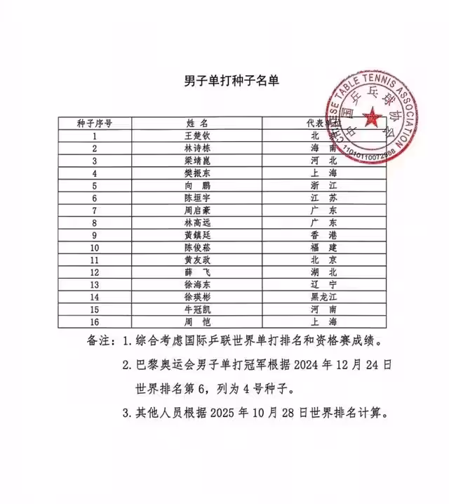 不過,王勵勤還是十分優待奧運單打冠軍的。根據乒協官宣的全運會種子名單顯示,樊振東和陳夢分別成為各自隊伍的第四號種子。其中巴黎奧運會的男女單打冠軍則根據2024年12月24日世界排名,兩人恰好各自列為4號種子;其他人則根據2025年10月28日世界排名計算。