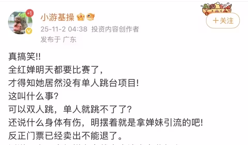 網友不滿的,一是廣東隊,既然不是臨時決定,為什麼不早點公開?要知道,很多人是從外地專門去廣州看全紅嬋的,除了門票,還有交通費用和食宿,都是不小的開支。另一個則是官網,為何不早點更新報項信息?一直拖到最後,很多人已經來到廣州,改行程都來不及了。