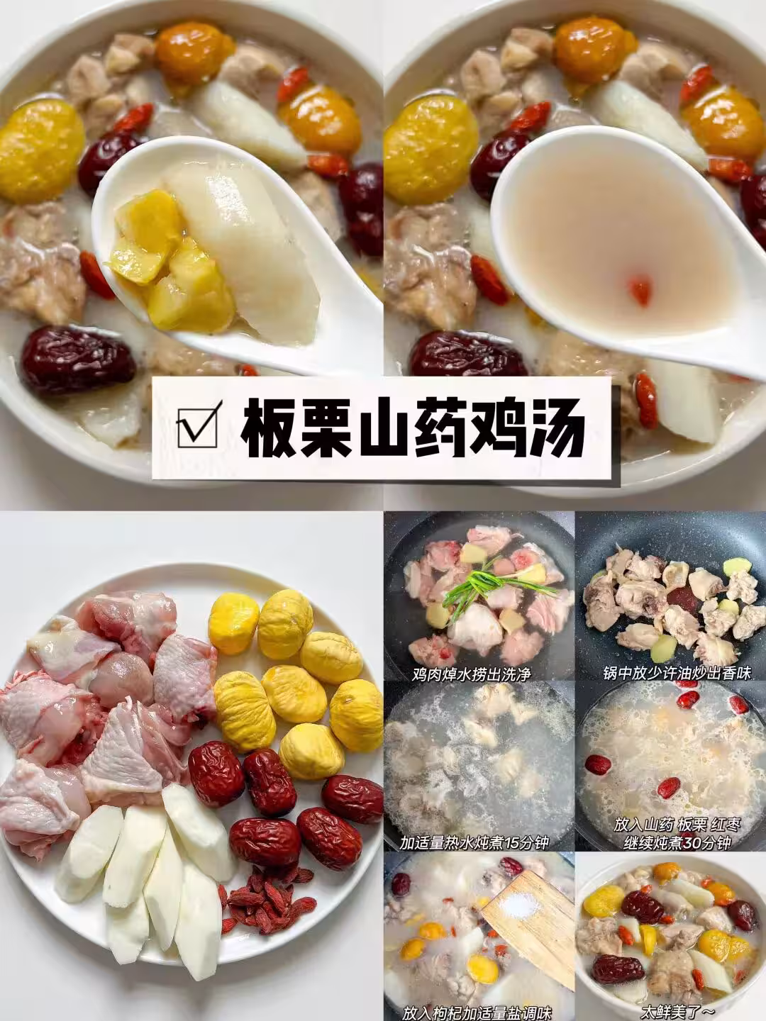 製作步驟: 雞肉焯水撈出洗凈 鍋中放少許油炒出香味 加適量熱水燉煮15分鐘 放入山藥 板栗 紅棗 繼續燉煮30分鐘 放入枸杞加適量鹽調味 ✅四、綠豆蓮子排骨🍖湯