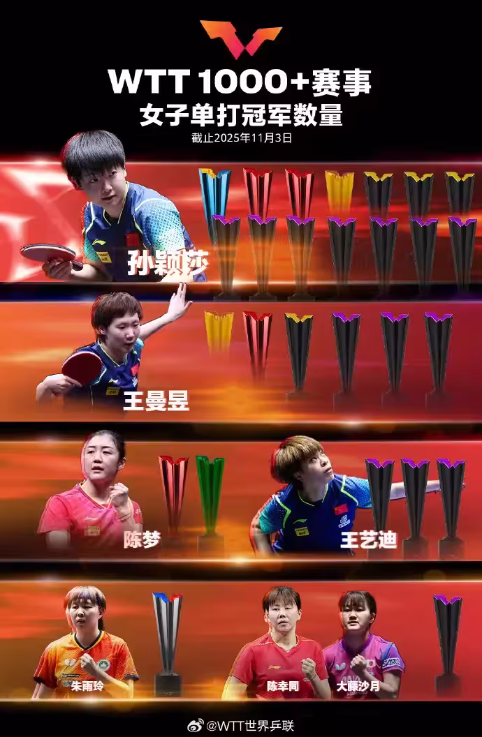 __WTT1000冠軍榜:孫穎莎14冠,王楚欽11冠,樊振東5冠,王藝迪3冠