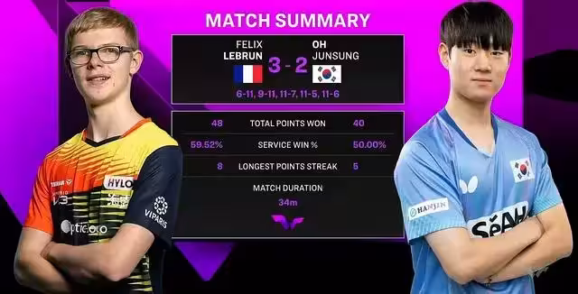 吳晙誠這場比賽大了個夢幻般的開頭,前前兩局他預判精準、反應敏捷、擊球優質,在前三板取得巨大收益,直落兩局,把小布推向絕境。但是小布已經兩年穩踞TOP10,大賽經驗和心理強韌度遠非吳晙誠可比,隨後三局,小布把比賽帶進了自己最擅長的「急急節奏」,吳晙誠迅速被打亂方寸,小布電光石火般完成超級的逆轉,奉上法蘭克福站第二例讓二追三大戲。第一個讓二追三的主角是德國名將弗朗西斯卡,他在前一天的比賽中,極限逆轉擊敗了法國隊的力廉·巴德。