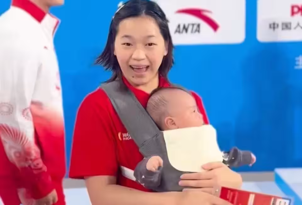 全運會男團決賽結束後,全紅嬋幫謝思埸帶娃,非常細心地照顧大侄子,這不禁讓人想起四年前,14歲的全紅嬋在跳上謝思埸後背的一幕。