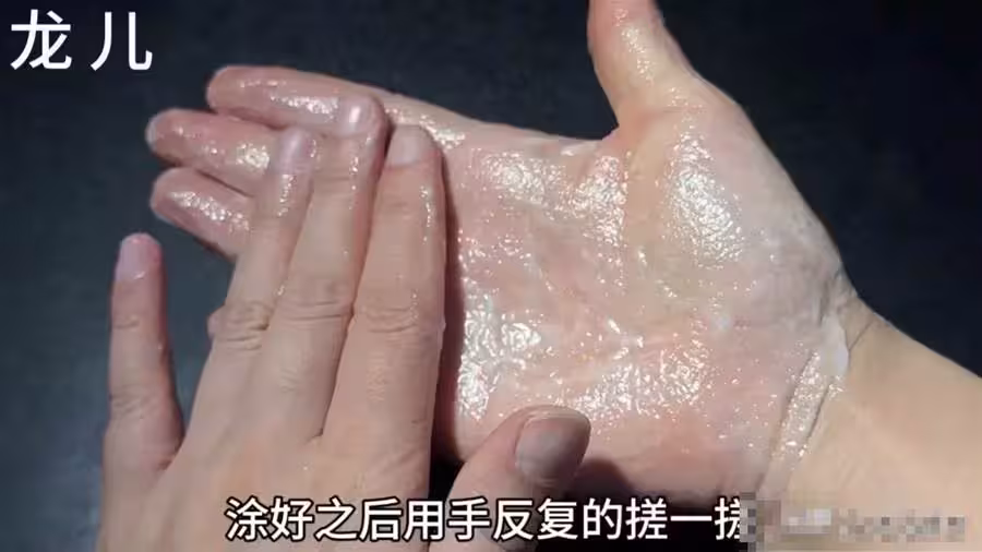戴上手套之後,我們用手從指尖處輕輕的往下扒一扒,儘量把手套裡面的空氣排空,讓它和手更加服帖,像這個樣子就好了,讓它在手上保持15~20分鐘,15~20分鐘之後我們再把它去掉。