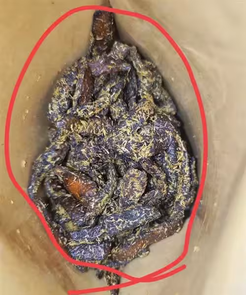 結果打開盒子一看——我瞬間火冒三丈!盒子裡裝著深褐色、看起來黏糊糊的片狀物,上面還撒滿了紅色粉末,看起來像是發霉了似的。