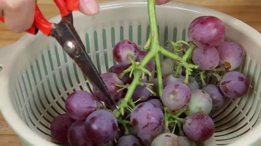 清洗葡萄的第1步就是要將葡萄粒全部分離下來,但一定不要直接摘下來,那樣葡萄就會有缺口,細菌很容易就能夠進去,所以咱們需要用一把剪刀。