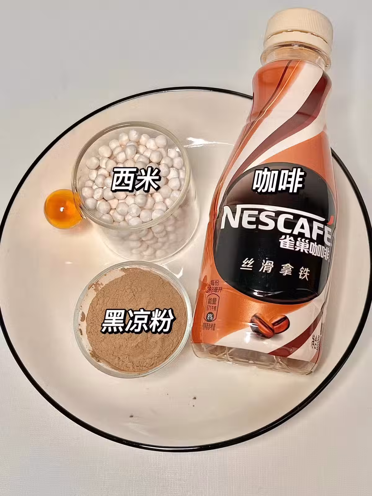 4.過濾倒出碗里,放冰箱冷藏2小時、凝固後劃十字切成小塊;放入西米,冰塊,再倒入咖啡攪拌均勻就可以開吃了