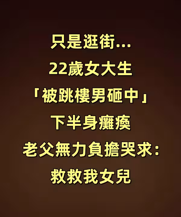 只是逛街…22歲女大生「被跳樓男砸中」下半身癱瘓 老父無力負擔哭求:救救我女兒