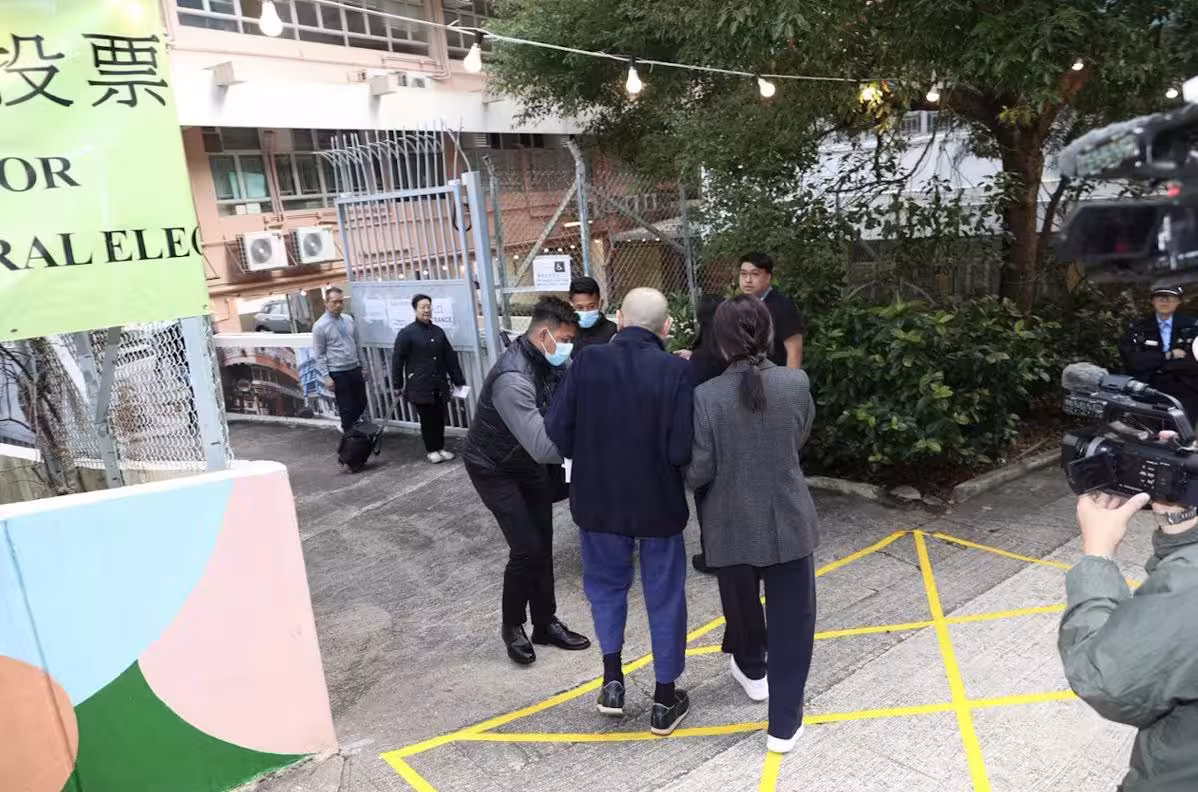 74歲劉鑾雄坐輪椅現身,需甘比攙扶起身,保鏢助理共五人相伴在旁