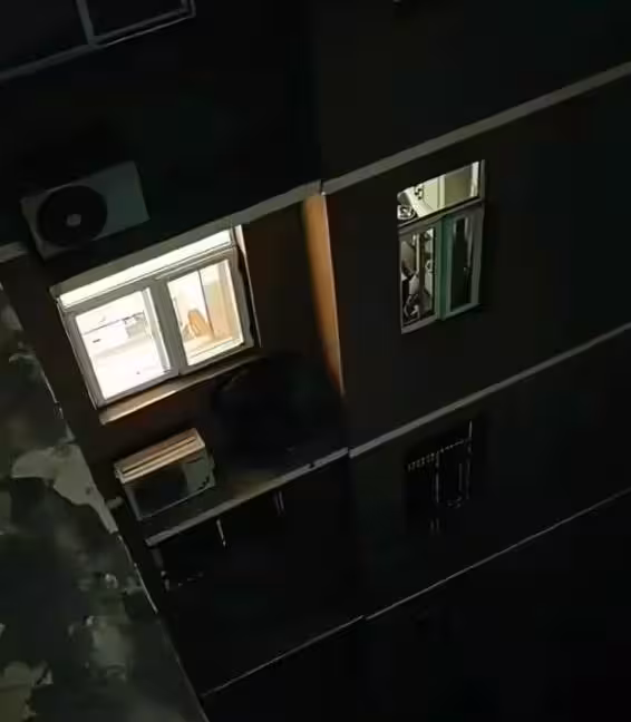 那片原本看不太清楚的右下角,在曝光拉高後,竟然出現一個模糊的人影——像是一名男子,側身站在窗外那條超窄的平台上,整個人緊貼著外牆,好像在躲什麼似的。