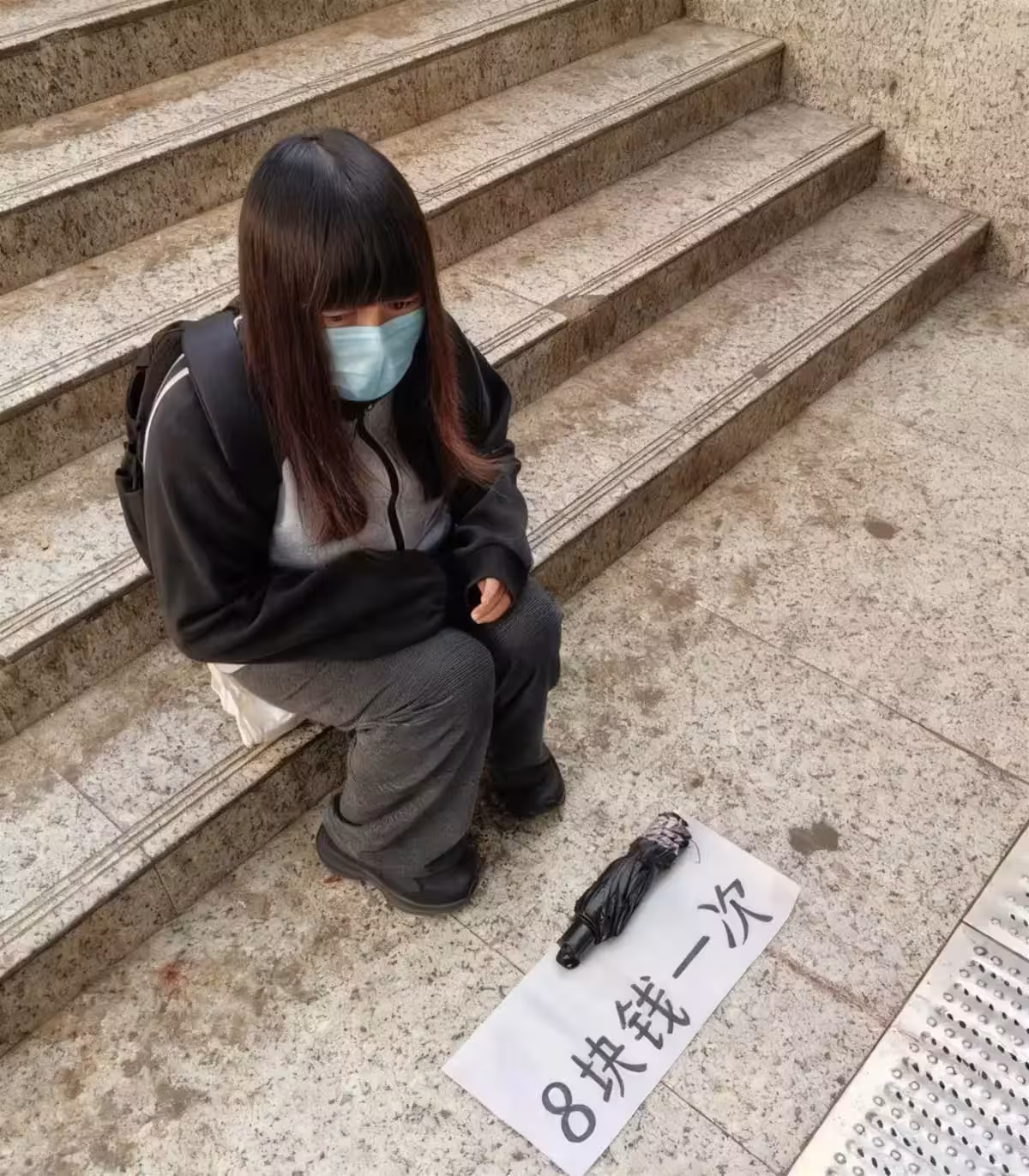在城市中心的商業區露天樓梯口,一個戴藍色口罩的年輕女子坐在冰冷的花崗岩台階上。她面前擺著一張白紙,紙上「8塊錢一次」的黑色大字格外醒目,旁邊放著從未撐開的黑色雨傘。這種看似「租賃雨傘」的擺攤,實則是當下最新的乞討方式。