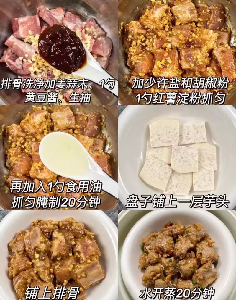 2. 芋頭去皮切塊,鋪在盤底,上面擺上腌好的排骨。