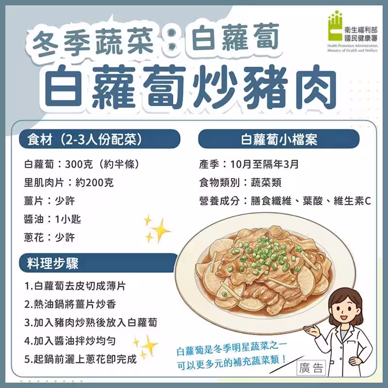 衛生福利部國民健康署分享「白蘿蔔炒豬肉」食譜。