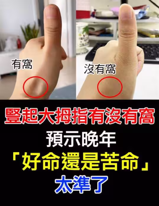 【本報訊】「豎大拇指就能看出晚年命運?」近期網絡瘋傳:只要豎起大拇指,觀察指根有沒有「窩」,就能預測晚年是「好命還是苦命」,准到離譜!命理師指出,這個「窩」其實是手掌肌肉與骨骼的綜合表現,側面反映一個人長期的生活習慣與心理狀態,間接預示晚年運勢。