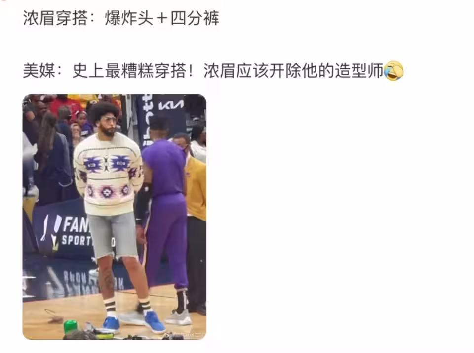 就在很多球迷還一眼蒙的時候,直到看到戴維斯的新造型穿搭後,也徹底忍不住了。頂著一頭爆炸頭髮型,上身穿了一個大花毛衣,下身卻弄了一個緊身的4分牛仔褲,還穿了一雙長筒白襪子,實在是太別致了。除此之外,這套造型將戴維斯顯得特別臃腫,尤其是肚子就像是出來個籃球一樣大。
