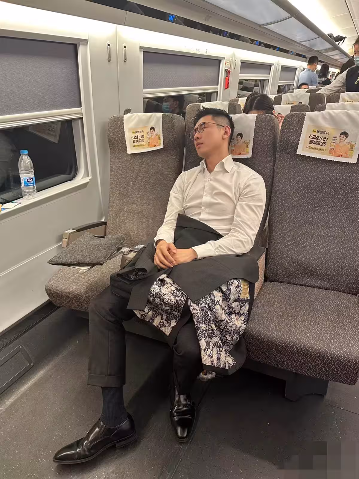 他睡著了。頭微微側向車窗,睫毛在眼瞼下投出淺淺的陰影。剪裁得體的西裝,一絲不茍的領帶,鋥亮的皮鞋,連握著手機的手都骨節分明。燈光灑在他身上,整個人散發著一種從容儒雅的氣質。