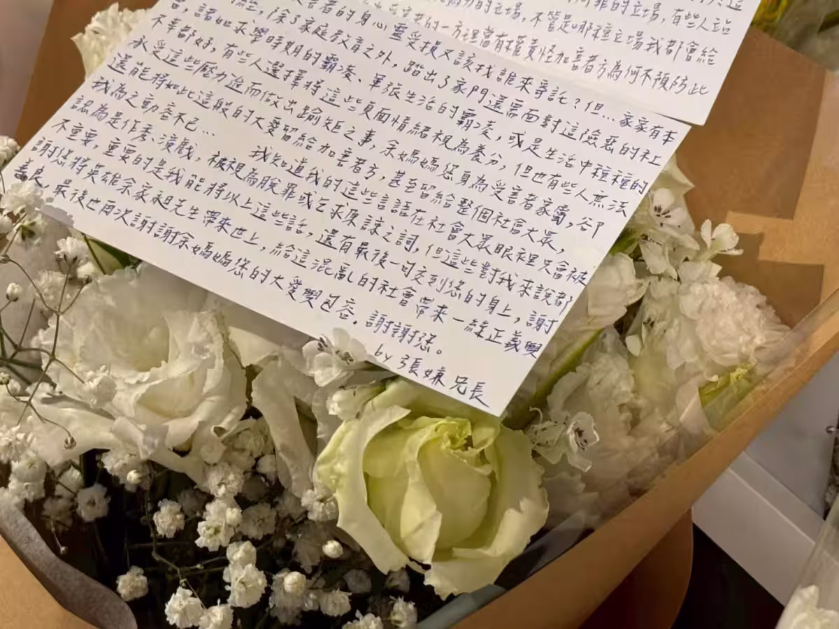 或許我知道消失於社會的目光上對我來說是最好的選擇,或許我知道我的立場根本沒有資格在此處為您獻花,但從新聞上看到余媽媽您對於張嫌家造成的傷害,依然給守大愛與包容,讓我下定決心即使遠在南台灣也一定要上來將這束花與這些言語交到您身上。