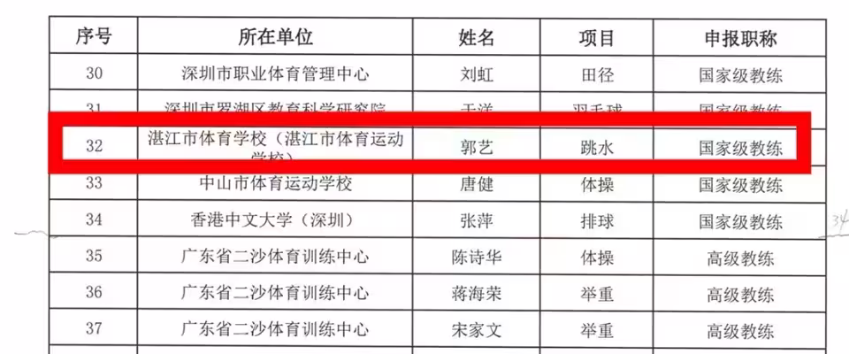 國家級教練員是中國體育教練員專業技術職稱的最高等級,相當於正教授。筆者注意到,此次廣東共有34人通過國家級教練評審,他們中的絕大多數是在省級或廣州、深圳兩地體育訓練單位工作或擁有奧運冠軍背景,郭藝是湛江市體育學校(湛江市體育運動學校)跳水教練,他作為來自地市級的基層教練躋身國家級教練行列,殊為不易,獲得國內體育專業最高等級職稱,是對郭藝在平凡崗位做出不平凡業績的充分肯定。