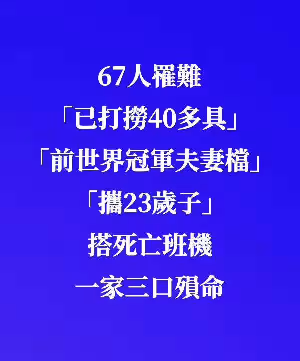 發生一起震驚美國的重大空難意外,一架載有64人的美國航空客機,與載有3人的軍方黑鷹直升機相撞,兩架飛機雙雙墜入波多馬克河(Potomac River),美國總統川普於30日證實這起空難無人生還,67人全數罹難,知情人悲曝:「世界冠軍夫妻檔也在這次墜機事故中罹難!」