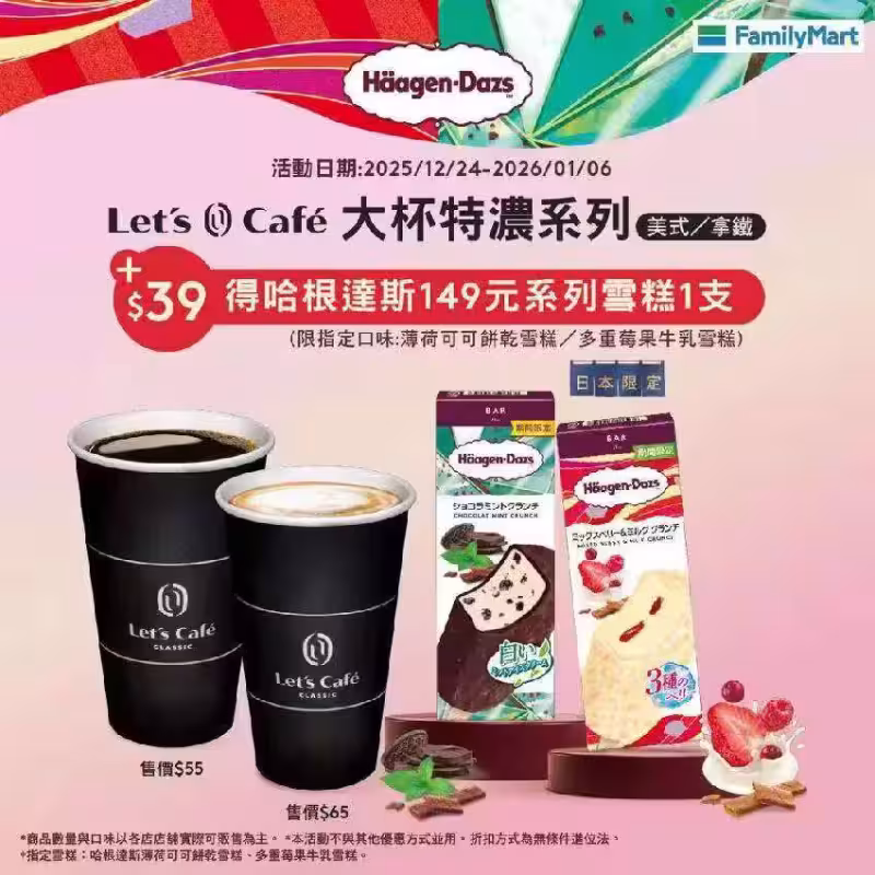 此外,全家今(26)日宣布最新優惠,即日起至2026年1月6日,購買Let’s Café 大杯特濃咖啡(美式/拿鐵),即可以39元加價購149元系列哈根達斯雪糕1支