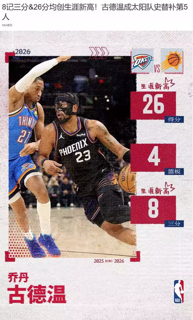 需要說明的是,據NBA中國官網報道:單場替補命中8記三分、合計26分的兩項數據也讓古德溫成為太陽隊史替補第5人。