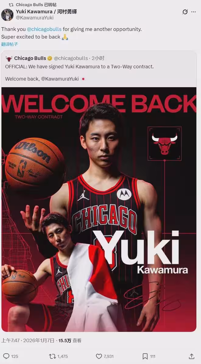 1月7日上午,芝加哥公牛官方宣布:球隊用雙向合同簽下日本後衛河村勇輝。河村勇輝轉發並寫道:「感謝公牛再次給我機會,非常興奮能夠回來。」為了給河村勇輝騰位置,今天公牛裁掉雙向合同球員特倫廷-弗勞爾斯。