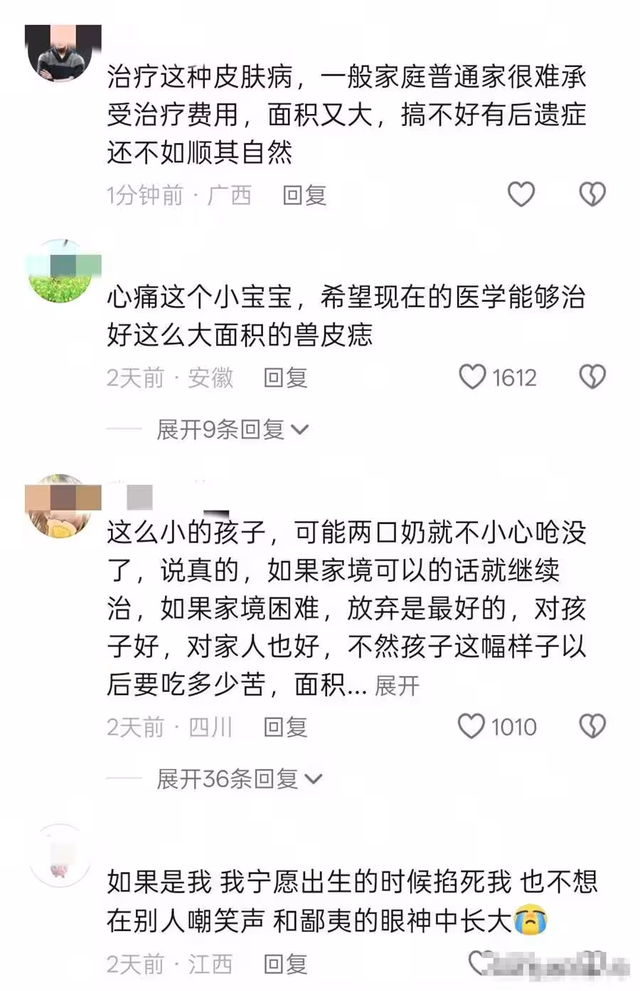 這件事也引起了網友討論,有網友直言「變成這樣,寧願不出生」,說的也是啊,如果不去治療,孩子以後恐怕都要在異樣的眼光中度過了,皮膚病本來就難治,患上這種疾病,無疑整個家庭的天都塌了!