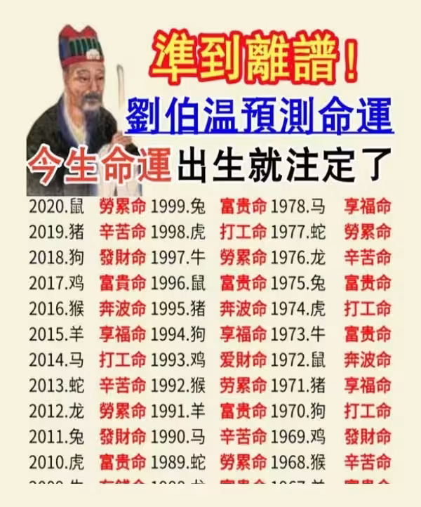 准到離譜!劉伯溫預測命運!今生命運出生就註定了!【本報訊】「一出生就註定一生富貴?」近日網絡瘋傳「劉伯溫出生年預言表」,只要對照自己的西元出生年,就能秒看「今生命運」,從財運、事業到婚姻一次揭露,准到離譜!網友紛紛留言:「真的准!出生年完全說中我!」現在就來看看,你的出生年對應什麼命運吧!