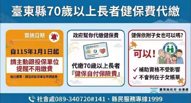 台東縣社會處說明,凡設籍台東滿1年以上,且年滿70歲以上的長者,就能獲得健保費代繳服務,健保自付保險費將由縣府自動協助代繳,依附在子女的健保名下的長輩也不影響資格,費用不會列入子女的健保帳單。