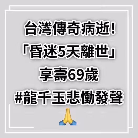 台灣傳奇病逝!驚傳「昏迷5天離世」享壽69歲!