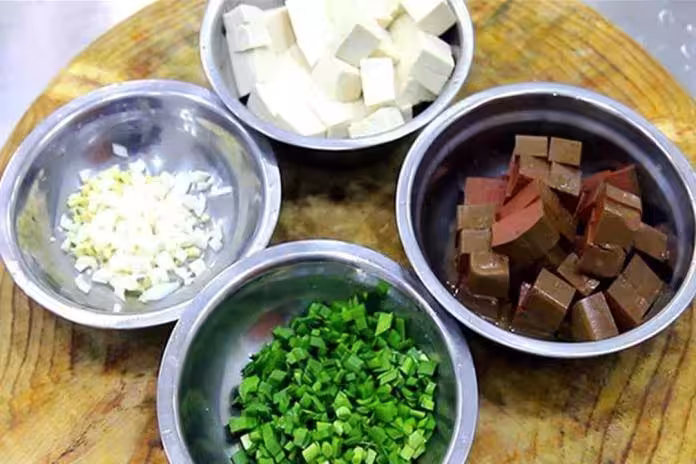 一、豬血推薦做法:【豬血燒豆腐】1.準備一塊嫩豆腐、切成方丁;豬血一塊,也切成同樣的方丁;大蒜拍扁、切成碎末,大蔥破開、切成蔥花,另外切一點韭菜花備用。2/30