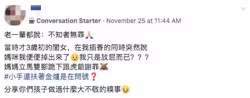 另外,也有不少人趁機分享自家小孩做過的糗事,「我家2歲半的把虎爺的香爐倒掉,說太髒了要洗,我整個當場差點暈倒」、「我女兒不小心把虎爺牌坐在屁股下」、「我小時後還偷吃過虎爺的東西,然後又在香爐上寫號碼污賴給虎爺,結果我阿嬤真的相信了,拿號碼去簽阿樂」。