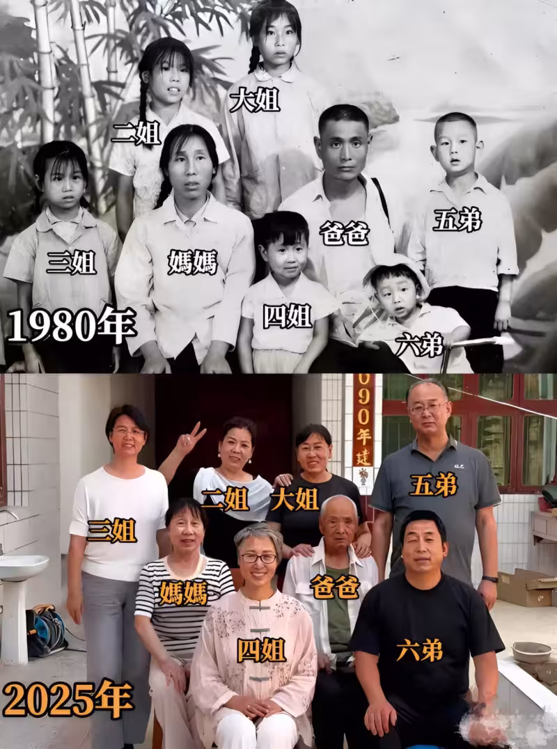 沒有豪宅名車,沒有錦衣華服。吸引我目光的,甚至不是容貌的變遷,而是一個最簡單、也最震撼的事實:從1980到2025,橫跨整整四十五年,兩張全家福,七個人,一個都沒少。