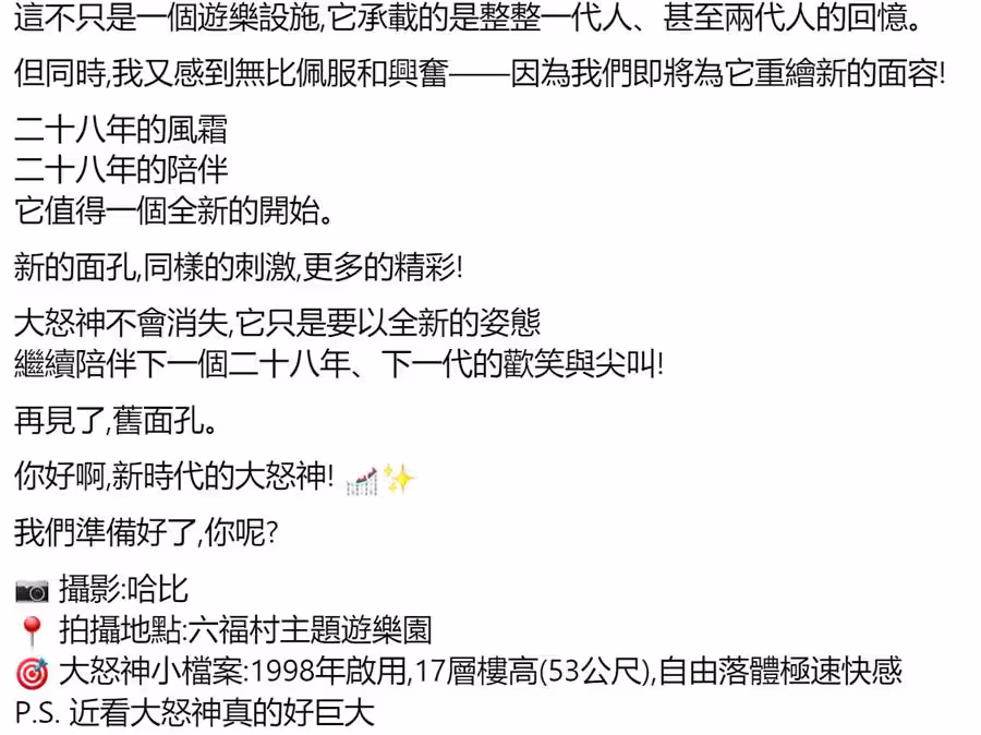 六福村指出,大怒神不僅是遊樂設施,更承載著一代甚至兩代人的回憶。28年來,它見證了無數尖叫、歡笑與勇氣,也挺過921大地震的搖晃、颱風的侵襲以及八八風災的考驗,每一次天災之後仍矗立守護來訪的遊客。