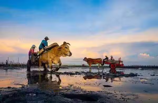 他每天親自採收牧草餵養水牛、駕駛牛車載運蚵仔,用最傳統方式保留文化真實面貌。