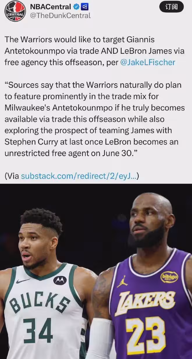 名記Fischer:勇士計劃今年夏天交易來字母哥,並在自由市場簽下詹姆斯......