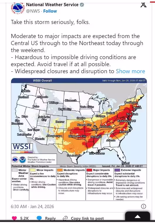 這場冬季風暴預計將緩慢橫越美國,為華盛頓特區、巴爾的摩、費城與紐約等城市帶來大雪。預報顯示,南落磯山脈與高原平原地區將出現強降雪,隨後影響中大西洋地區,並一路延伸至美國東北部。