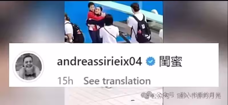 「閨蜜」二字,情深意長! 在世界泳聯跳水世界盃蒙特婁站女子十米台決賽中,16歲的嬋寶以5跳458.20分,以接近20分的斷崖式領先奪冠,獲得本站女單、女雙10米台雙冠王。銅牌得主斯潘多里尼向她表示祝賀,並在她社交平台上曬出和嬋寶擁抱的照片,並標註漢字「閨蜜」。