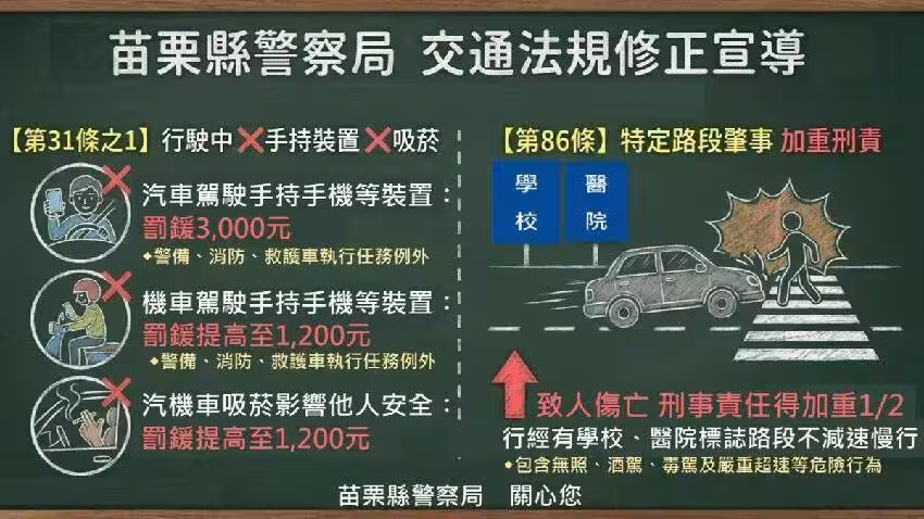 苗栗縣警察局說明,騎機車時若以手持方式使用行動電話、電腦或其他裝置,罰鍰從1千元提高到1200元,另汽、機車行駛中手持香煙、吸食或點燃香煙,致影響他人行車安全者,罰鍰從6百元提高到1200元。