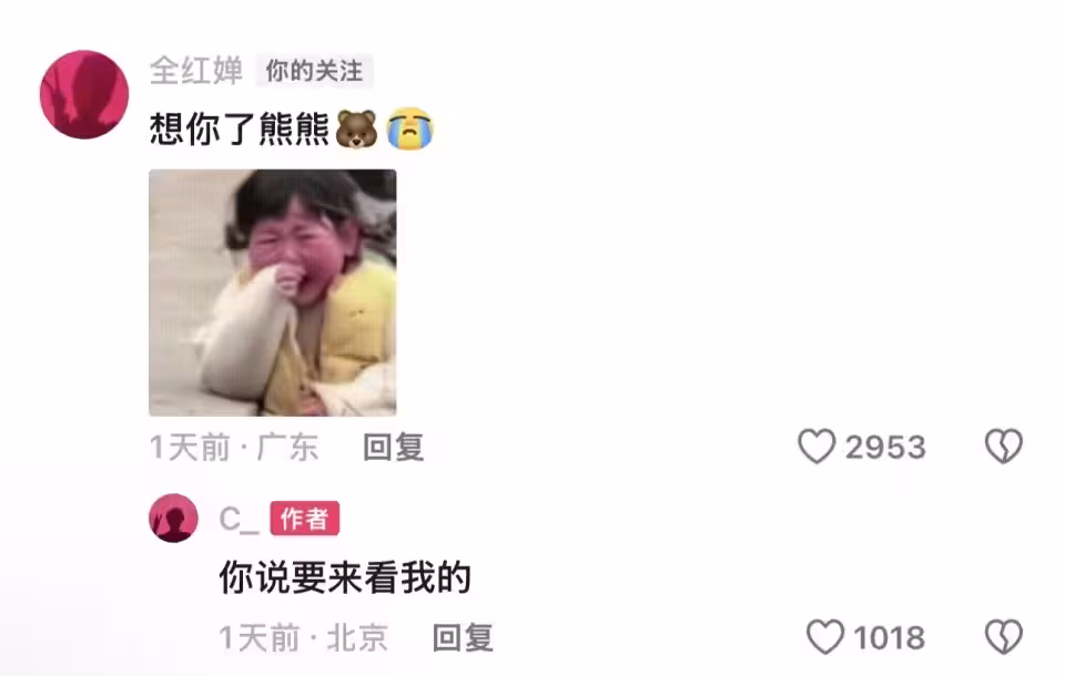眾所周知,全紅嬋和陳藝文是非常好的朋友,她留言道:「想你了熊熊!」還配上了一個「大哭」的表情包,IP位址顯示是在廣東。