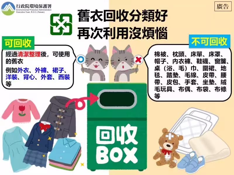 此外,像棉被、枕頭、床單、襪子、窗簾、地毯等,這些都是不能回收,環保局呼籲民眾務必將舊衣物做好回收和正確丟棄,若未依規定丟棄者,可依《廢棄物清理法》處以新台幣1200元至6000元的罰款。