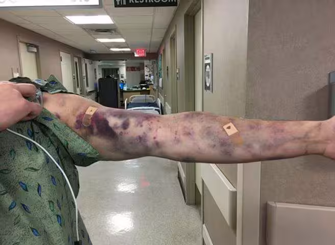 才過沒幾小時,他的手臂竟然出現一塊一塊的瘀青,而且疼痛到無法忍受!傑伊的老婆在擔憂之下,馬上送他到醫院治療,沒想到醫生檢查後竟然查不出病因,根本不知道他是被什麼蟲咬傷,也不知道為什麼會出現這樣的症狀!