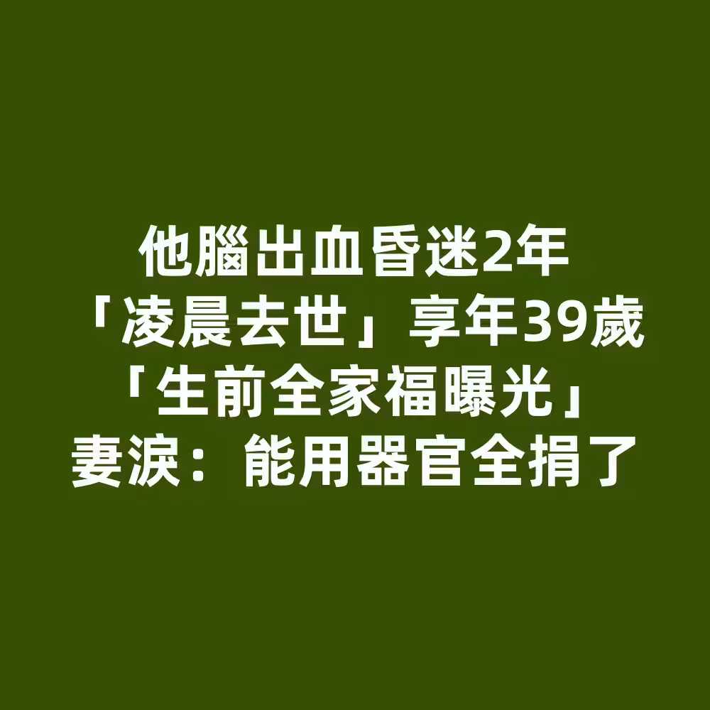 他腦出血昏迷2年「凌晨去世」享年39歲!!! 「生前全家福曝光」妻淚:能用器官全捐了