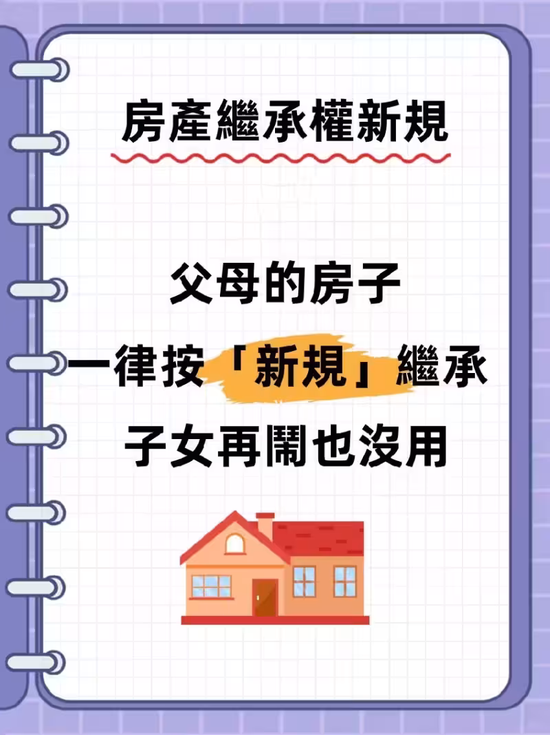 新規規定,即使父母生前有遺囑,也必須為未滿18周歲的子女預留不低於30%的房產份額,惠及全國約2800萬未成年人。