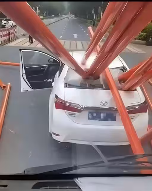 白色轎車駕駛——一位約三十歲的年輕媽媽——竟自己推開變形的車門,在路人攙扶下走了出來。她臉色蒼白但意識清醒,隨後副駕駛座的丈夫也自行脫困。最令人難以置信的是,事發時后座正坐著他們五歲的女兒,而一根橙色鋼管就從兒童安全座椅左側擦過,距女孩僅十公分。