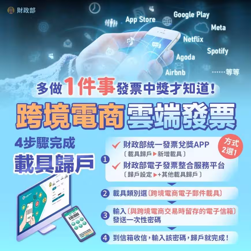 財政部表示,假設民眾在多個跨境電商消費,且都是使用相同的電子信箱,那麼就只要設定一次歸戶即可,且能透過APP或平台查看到每一筆消費,系統也會自動進行對獎、通知中獎的動作。