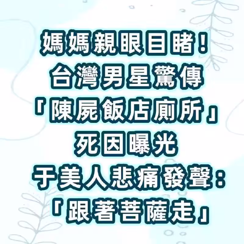 媽媽親眼目睹!台灣男星驚傳「陳屍飯店廁所」死因曝光 于美人悲痛發聲:「跟著菩薩走了...」