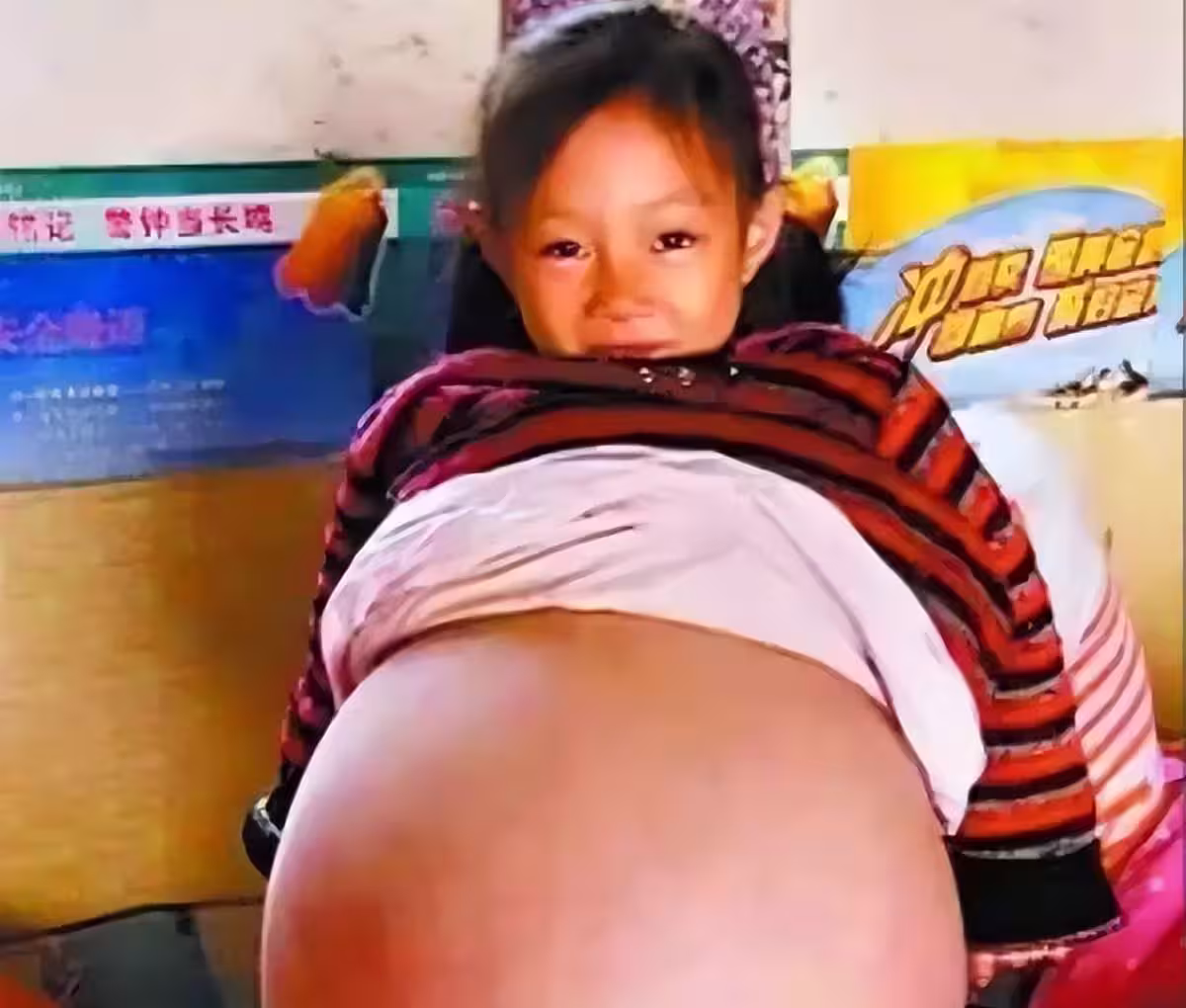 那就是她的肚子,小女孩身材纖細,但肚子卻比臨盆孕婦的還要大。