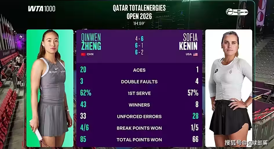 第一:全場數據統計,鄭欽文轟出20記ACE,對手肯寧全場僅1記ACE,數量比達到恐怖的20-1,只是鄭欽文的失誤稍微有點多,也跟剛剛復出有關,沒有達到最佳狀態。