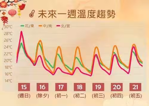 ▲除夕東北季風影響,早晚低溫變化不大,但白天高溫有明顯下滑。(圖/中央氣象署cwa.gov.tw)